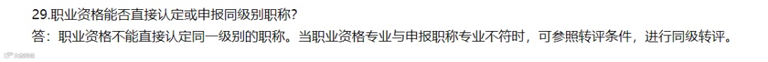 答:职业资格不能直接认定同一级别的职称。当职业资格专业与申报职称专业不符时,可参照转评条件,进行同级转评。