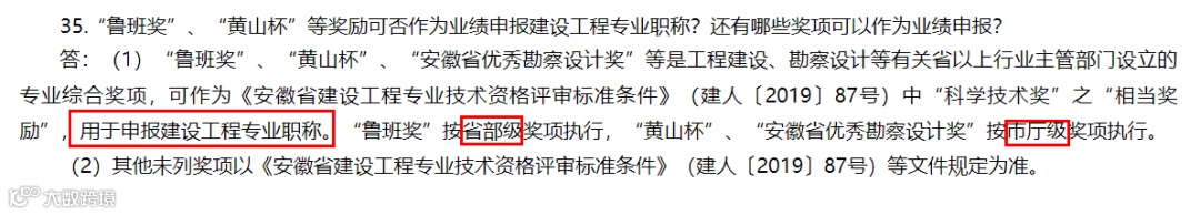答:(1)“鲁班奖”、“黄山杯”、“安徽省优秀勘察设计奖”等是工程建设、勘察设计等有关省以上行业主管部门设立的专业综合奖项,可作为《安徽省建设工程专业技术资格评审标准条件》(建人〔2019〕87号)中“科学技术奖”之“相当奖励”,用于申报建设工程专业职称。“鲁班奖”按省部级奖项执行,“黄山杯”、“安徽省优秀勘察设计奖”按市厅级奖项执行。