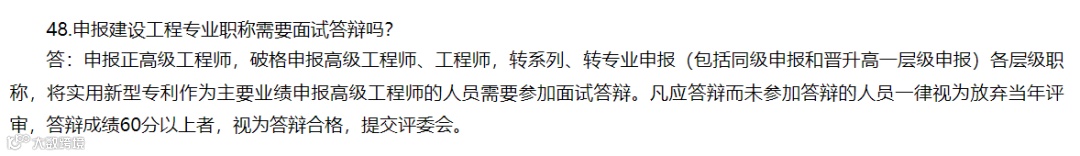 答:申报正高级工程师,破格申报高级工程师、工程师,转系列、转专业申报(包括同级申报和晋升高一层级申报)各层级职称,将实用新型专利作为主要业绩申报高级工程师的人员需要参加面试答辩。凡应答辩而未参加答辩的人员一律视为放弃当年评审,答辩成绩60分以上者,视为答辩合格,提交评委会。