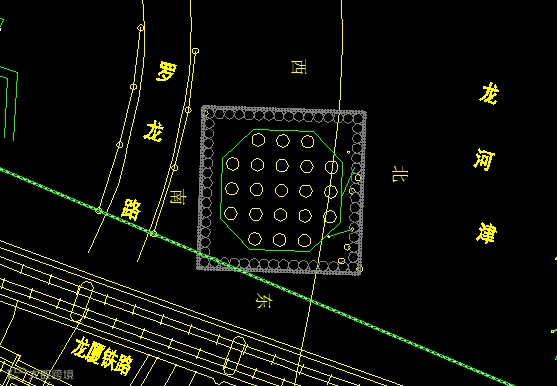 上图中间为主塔承台位置,共设置五排计21根桩基(桩直径2.5m)。承台北侧已部分侵入龙津河,东侧邻近龙厦高铁线,南侧侵占部分罗龙路,西侧紧挨商铺。施工空间极其狭小,还必须保证铁路安全(离铁路最近处仅15m),不能影响南侧道路的通行,还肩负龙津河的环保重任,也就是说除了主体结构空间之外,周围只有极少空间可用来施工。