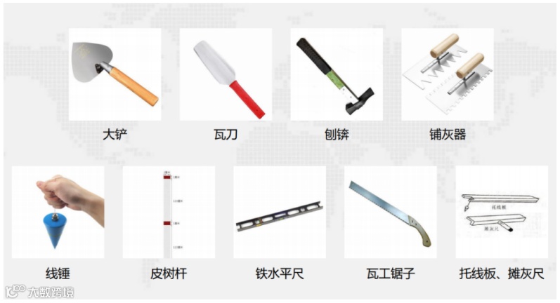 作为对比参照的3号楼采用人工砌筑,根据传统作业方法进行施工(如图3所示)组织和人员配备。由于工具原始(如图4所示),完全依靠砌工的体力劳动,因此体力消耗大,工效无法提升,质量情况也参差不齐。