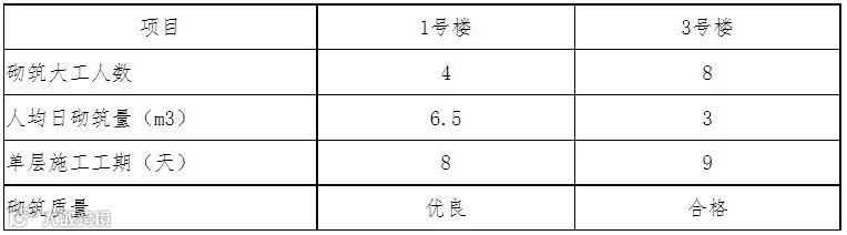 3号楼在工期紧迫、一再动员的情况下,人均日砌筑量也仅能达到3m3~3.5m3,该工作量相当于重物举升操作3t~3.5t,对于普遍高龄的从业人员,已接近体能极限。劳动力配置上,单层投入的砌筑队人员包括8名砌筑大工(负责粘合剂拌制和砌筑施工)和2名小工(负责材料搬运和卫生清理),单层砌筑工期约10天完成。