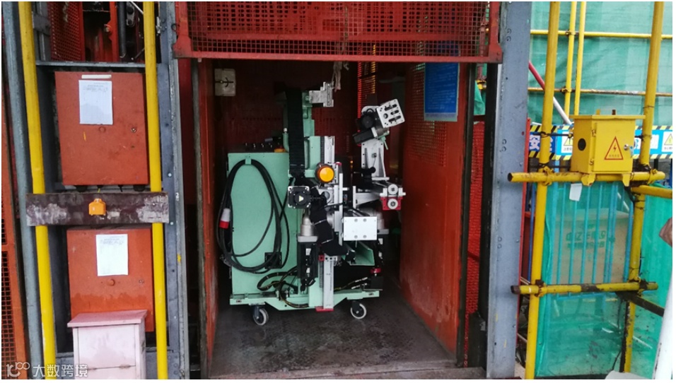 试点楼栋1号楼投入一台MOBOT GT30型智能砌筑机器人,该型机器人完全针对建筑室内砌筑的应用场景特点进行设计,具备轻量化的可折叠机身设计,可方便地通过施工人货梯进入作业楼层和遂行垂直转运(如图5所示)。在施工组织上,采取砌筑机器人和砌筑大工混合编成,区分大小工作面进行分工协作,以充分发挥各自的优势和效能。