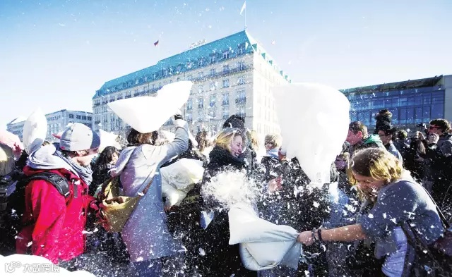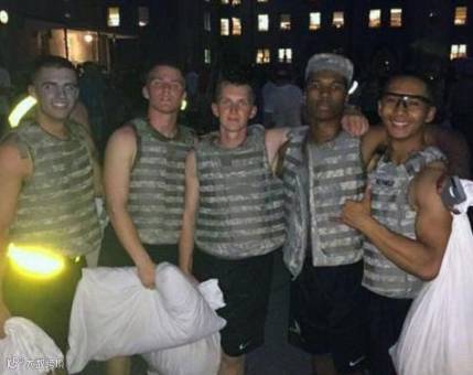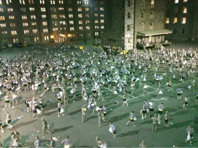 西点军校的这个Pillow Fight据说可以追溯至1897年。这是学校一年级生的传统活动,西点新生入学第一年要进行为期7周的严格培训,期间新生间甚至不能相互沟通。阻止这样的活动是用来增进学生之间的感情、培养集体精神,同时也为了庆祝夏季训练的完结。