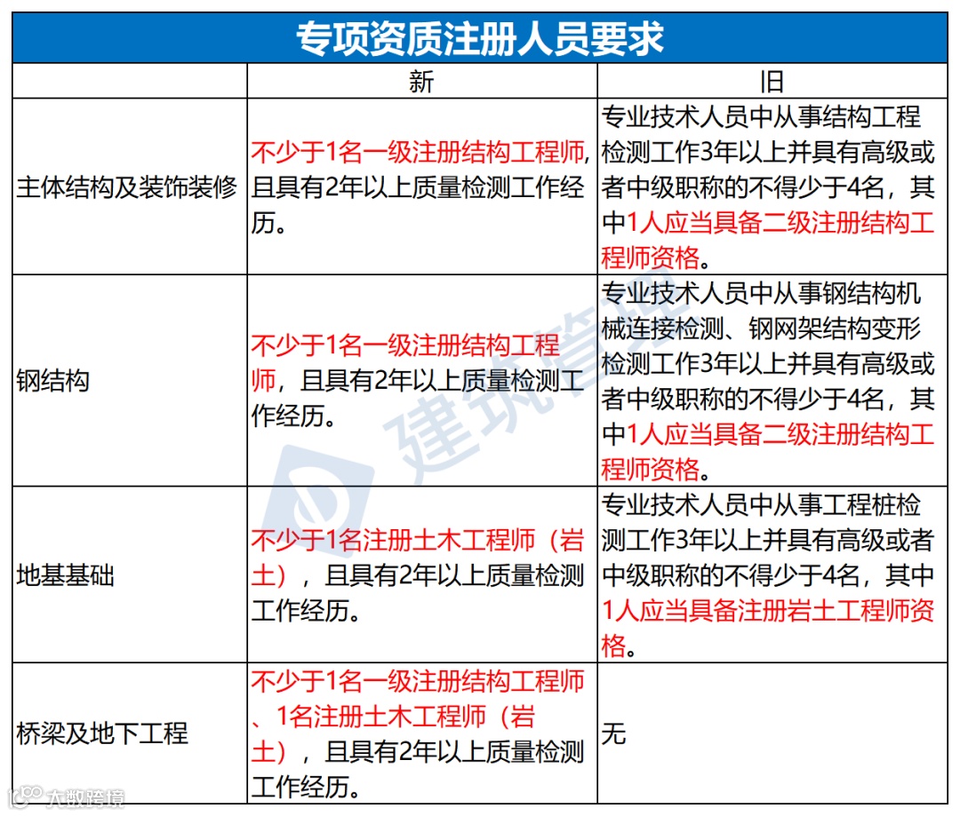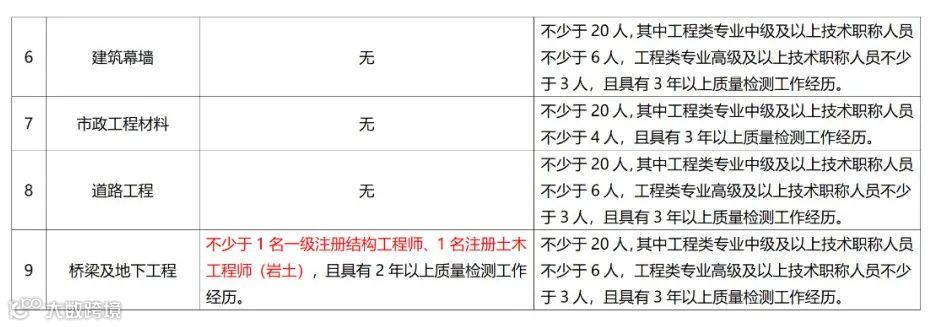 ⑵主体结构及装饰装修、钢结构、地基基础、建筑幕墙、道路工程、桥梁及地下工程等专项资质,应当具有3年以上质量检测经历。