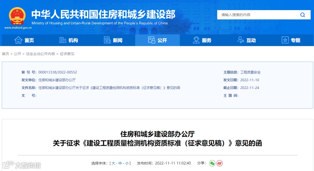 11月11日,住建部发布《关于征求《建设工程质量检测机构资质标准(征求意见稿)》意见的函》。本标准自2023年1月1日起施行。