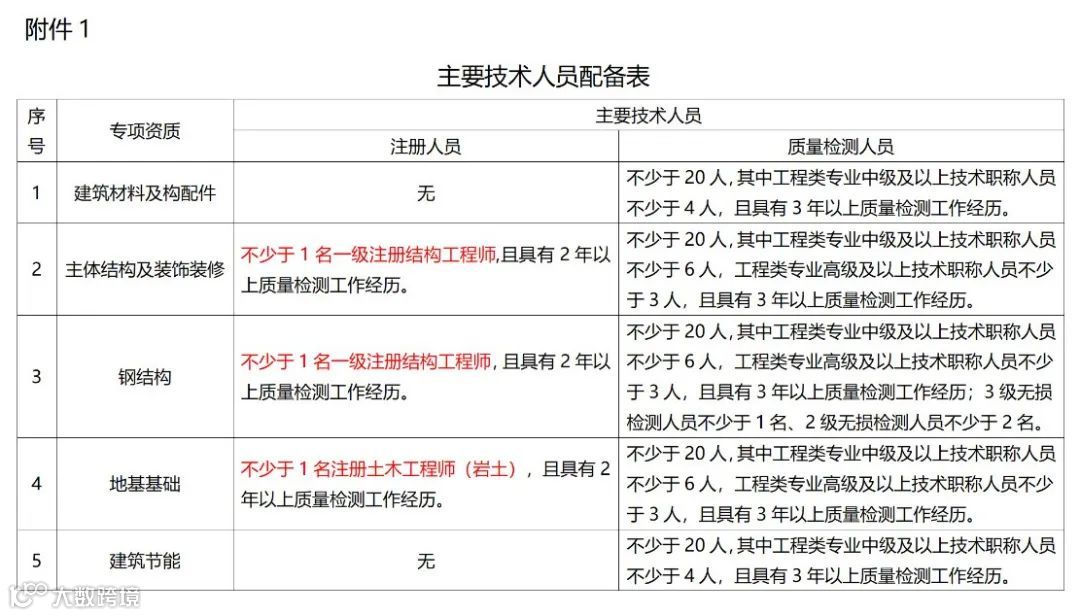⑵一级注册结构工程师不少于3名,注册土木工程师(岩土)不少于2名,且具有2年以上质量检测工作经历。