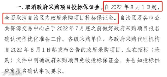 自2022年8月1日起,全面取消自治区内政府采购项目投标保证金。