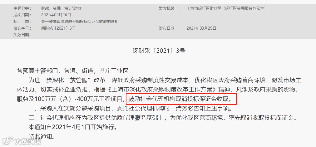 上海市闵行区印发《关于鼓励取消政府采购投标保证金收取的通知》:2021年4月1日起,凡涉及政府采购的货物、服务及100万元(含)-400万元工程项目,鼓励社会代理机构取消投标保证金收取。