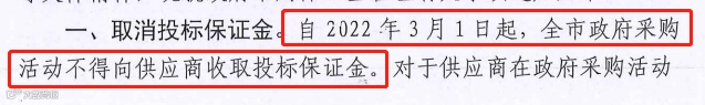 陕西安康:自2022年3月1日起,全市政府采购活动不得向供应商收取投标保证金。