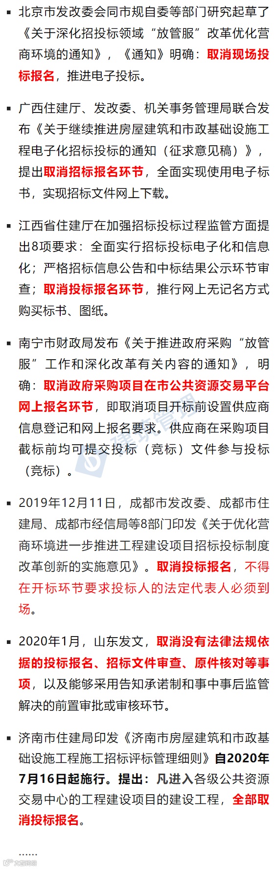 2019年5月15日,北京市发改委会等八部门印发《关于深化招投标领域“放管服”改革优化营商环境的通知》,《通知》明确:取消现场投标报名,推进电子投标。