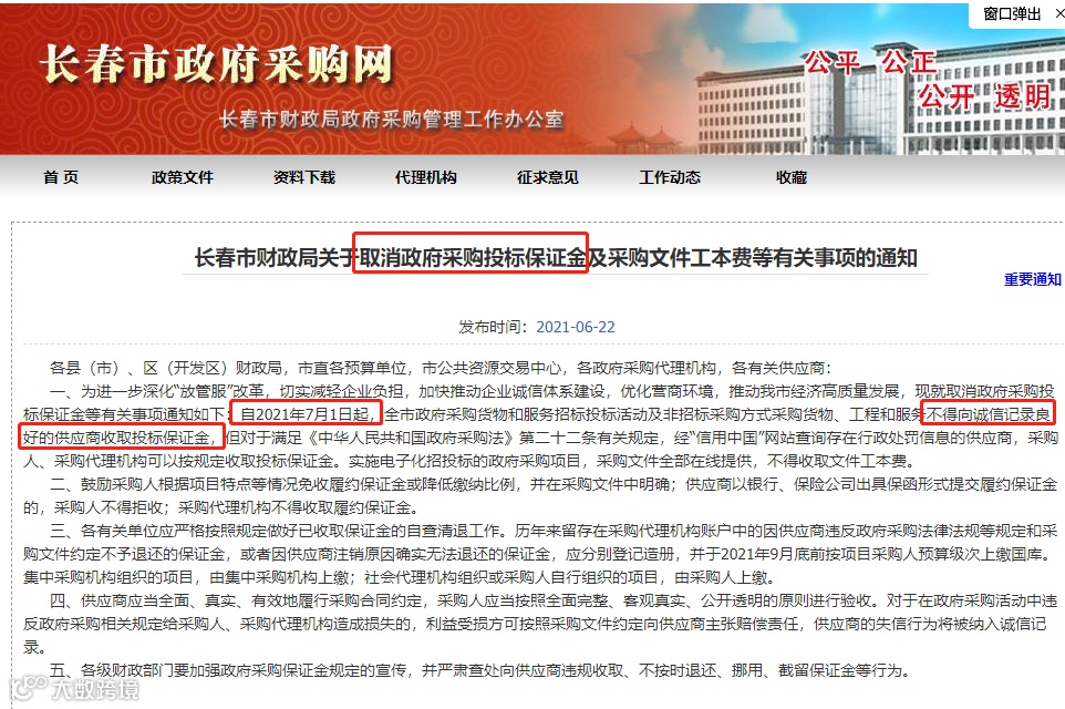 吉林省长春市:自2021年7月1日起,取消政府采购投标保证金。