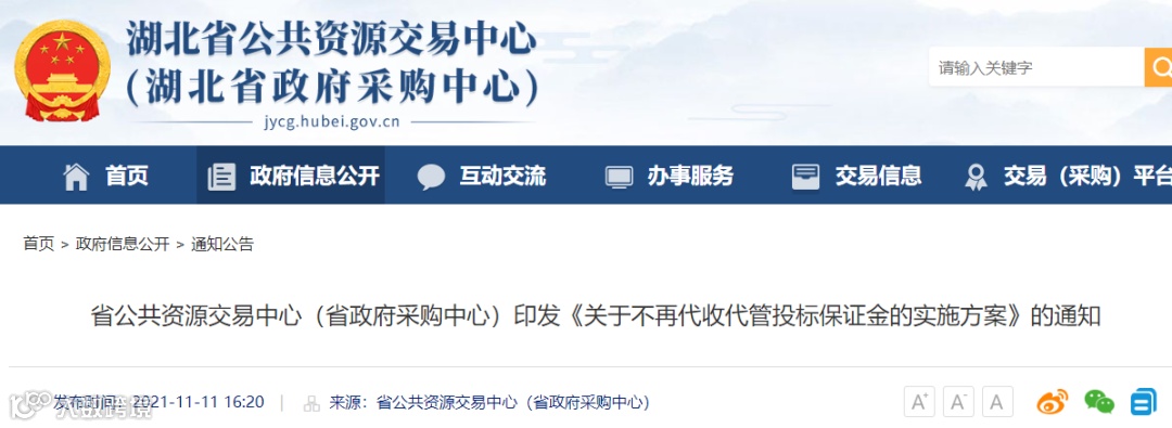 近日,湖北省公共资源交易中心印发《关于不再代收代管投标保证金的实施方案》。