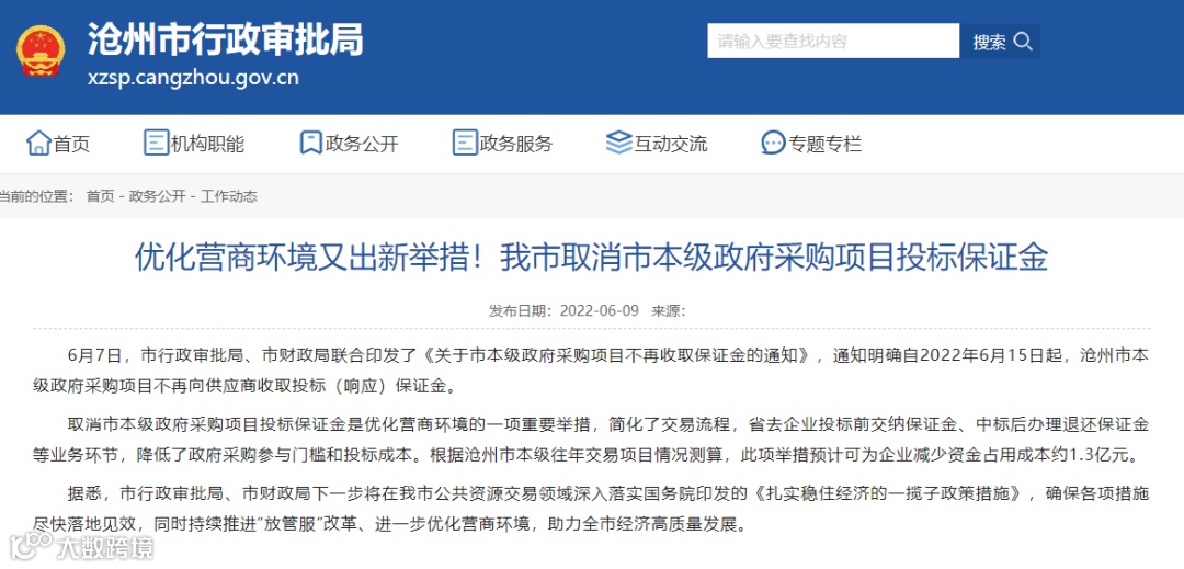 河北沧州:6月7日,市行政审批局、市财政局联合印发了《关于市本级政府采购项目不再收取保证金的通知》,通知明确自2022年6月15日起,沧州市本级政府采购项目不再向供应商收取投标(响应)保证金。