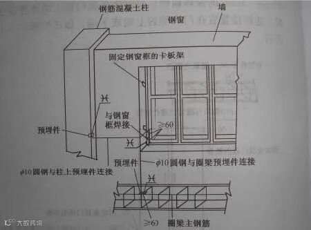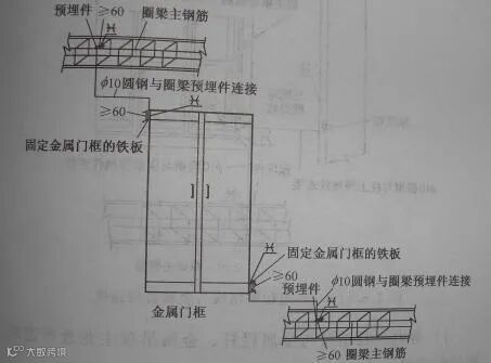 等电位联结线与金属窗的连接(如示意图):采用25㎜x4㎜的镀锌扁钢或φ10的圆钢,一端与圈梁预埋件焊接牢固,另一端与固定金属窗框的金属板焊接,也可通过搭接板(100㎜x30㎜x3㎜的镀锌扁钢)与固定门框上的预埋铁板连接,连接点不少于两处。