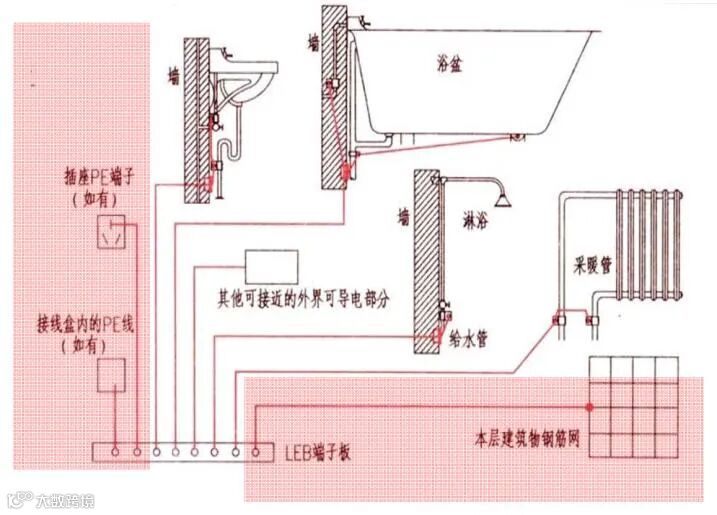 3、浴室内的等电位联结不得与浴室外的PE线相连,以防故障时引入危险电位。如浴室内有PE线,则必须要与该PE线做联结(例如插座线的PE端子或接线盒内的PE线);