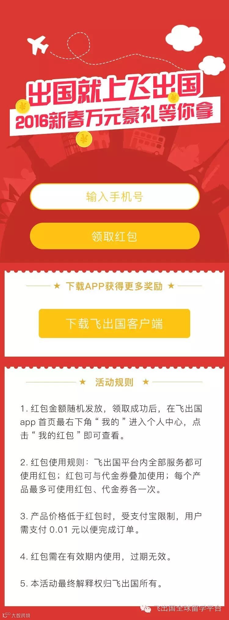 飞出国将在春节期间,面向平台新老注册用户发起2016万元红包活动。其中,500万红包用于支持入驻商家。