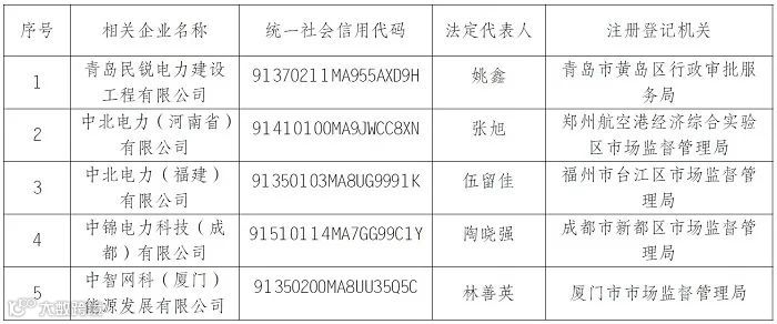公告显示,近期,国家电网经排查发现,青岛民锐电力建设工程有限公司、中北电力(河南省)有限公司、中北电力(福建)有限公司、中锦电力科技(成都)有限公司、中智网科(厦门)能源发展有限公司等5家企业通过伪造相关材料以及其他不当方式,将企业注册为国家电网系统内单位,并以国家电网系统内单位名义开展业务(具体企业信息详见下表)。