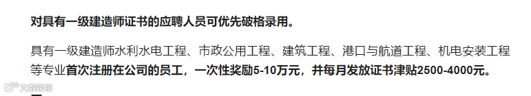 中铁很多分公司都有证书补贴政策,中铁十局下属单位: 考过一建奖5万,增项奖3万,每月再补贴3千。
