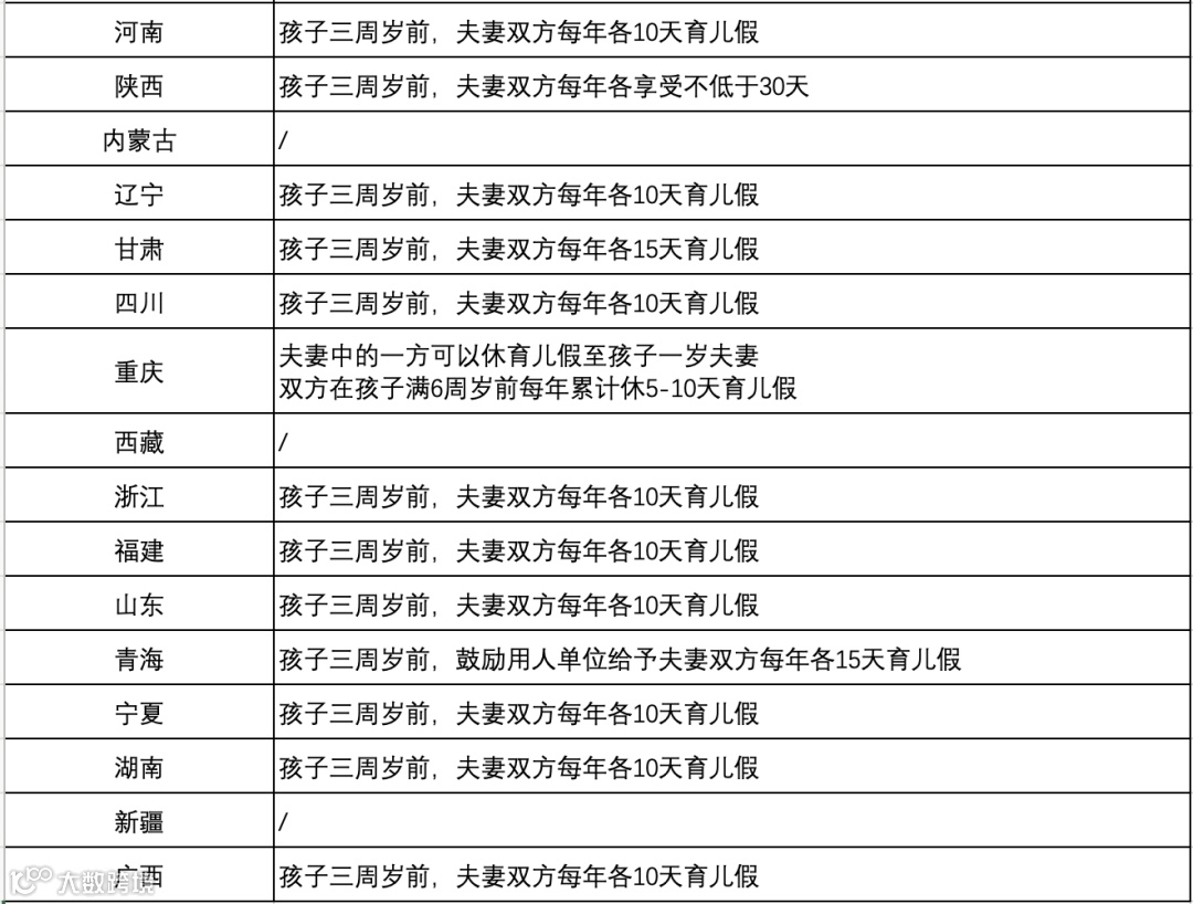 全国各省市育儿假一览表