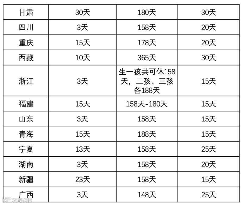 全国婚假、产假一览表