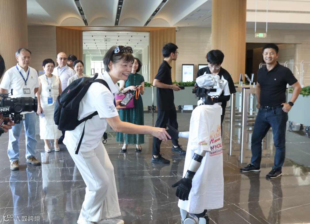 开业现场,曹主席与中国移动智能迎宾机器人互动