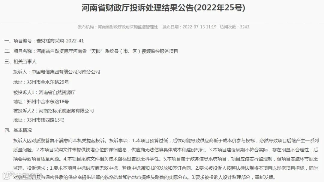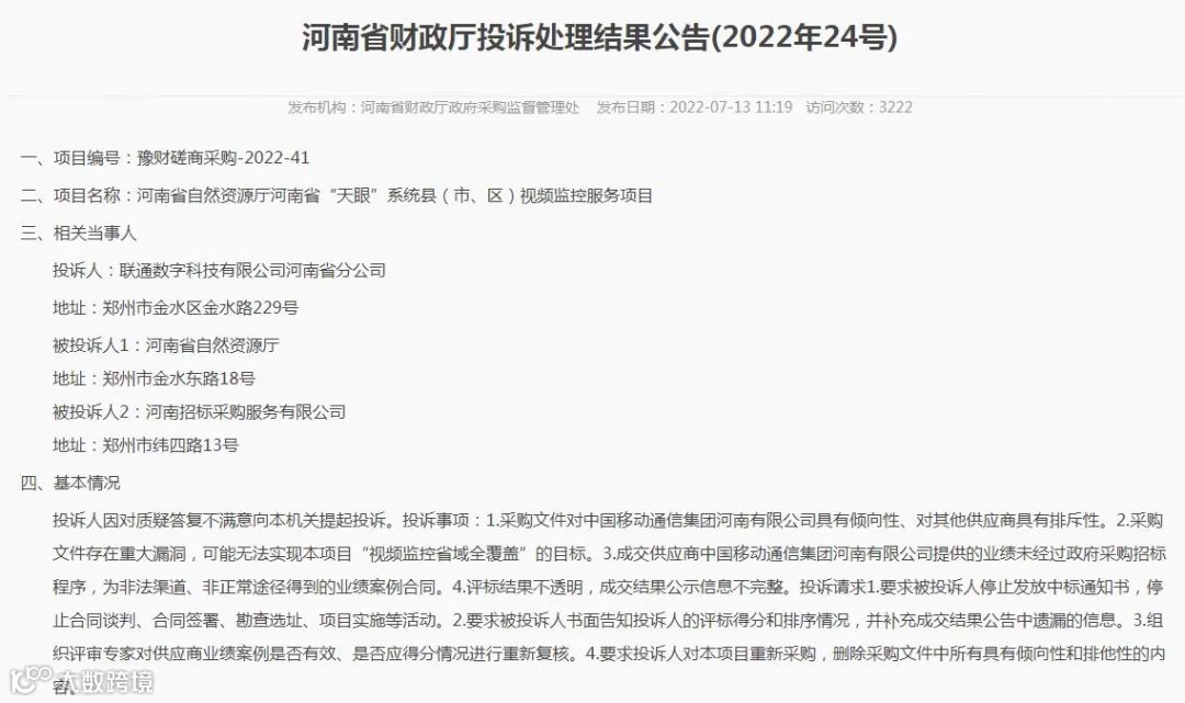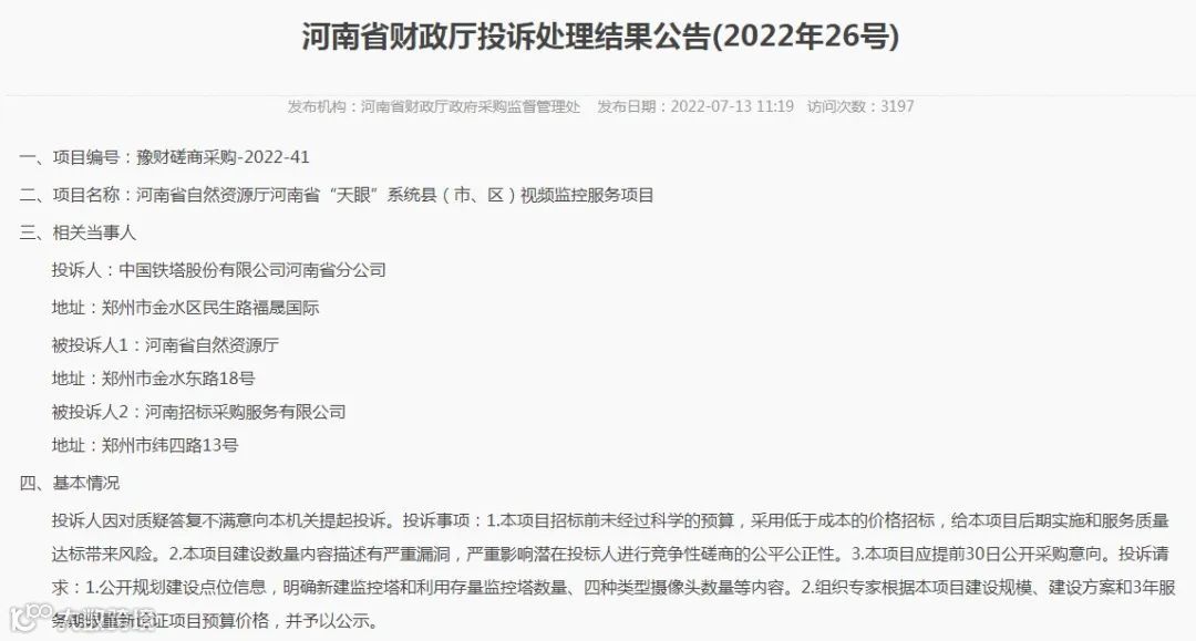 河南省财政厅7月13日发布了4则投诉处理结果公告(2022年24~27号),都是针对该项目,这4个投诉分别来自河南联通数科、河南电信、河南铁塔和河南联通,4家企业的投诉事项不尽相同,但都以失败告终。