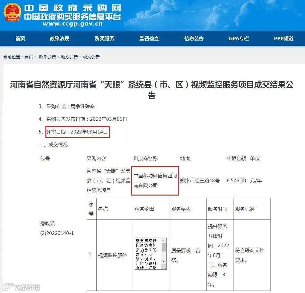 2022年3月,河南省“天眼”系统县(市、区)视频监控服务项目发布项目成交结果公告。