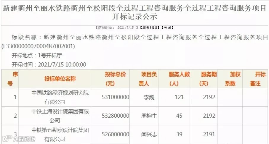 通过上图可以看到,该项目是新建衢州至丽水铁路衢州至松阳段全过程工程咨询服务;中标单位:中国铁路经济规划研究院有限公司;中标价:5.3亿;