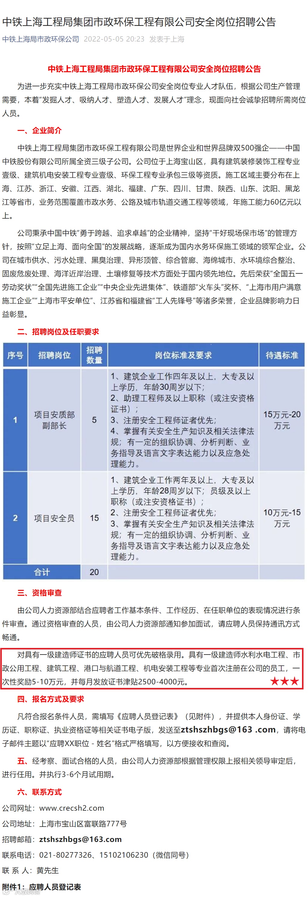 近日,中铁上海局市政环保公司官网发布安全岗位招聘公告,指出:对具有一级建造师证书的应聘人员可优先破格录用。具有一级建造师水利水电工程、市政公用工程、建筑工程、港口与航道工程、机电安装工程等专业首次注册在公司的员工,一次性奖励5-10万元,并每月发放证书津贴2500-4000元。