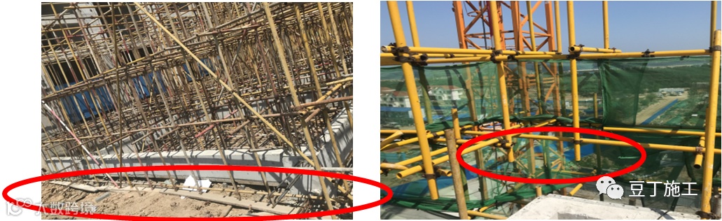 模架体系缺少一个方向或两个方向顶部小横杆,导致自由端超高;个别项目模架立杆部分悬空。