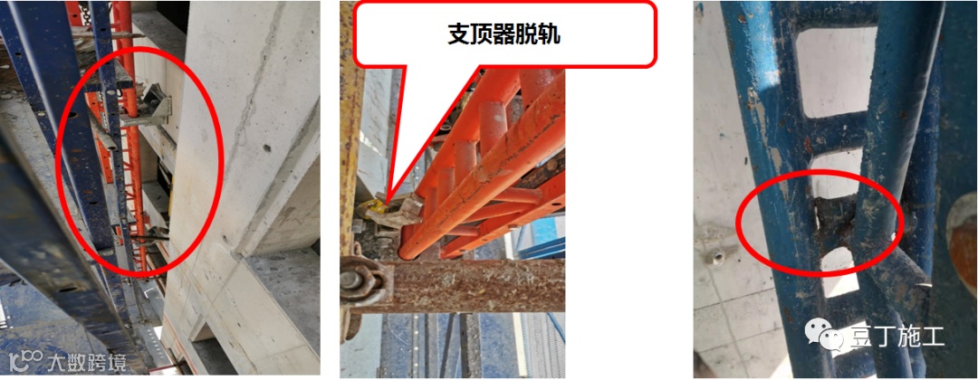 顶层局部缺失支座,支顶器安装不规范,关键承重构件开裂;