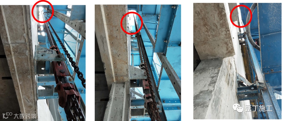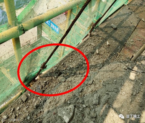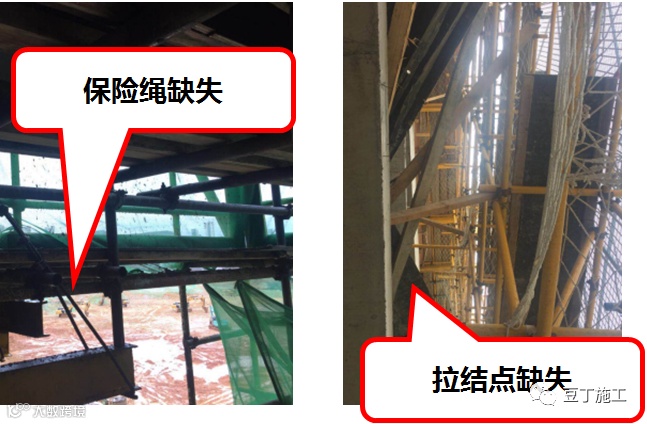 钢丝绳使用不规范:采用卸扣和拉环拉结、共用拉环、用一根绳对折使用、与结构摩擦无隔离。