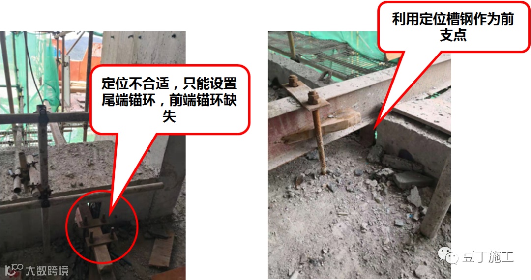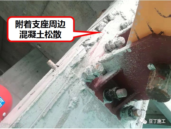 附着预埋螺杆数量与方案不符,方案为六根螺杆,实际为四根。附着螺栓边缘混凝土太薄,不能有效固定附着支座
