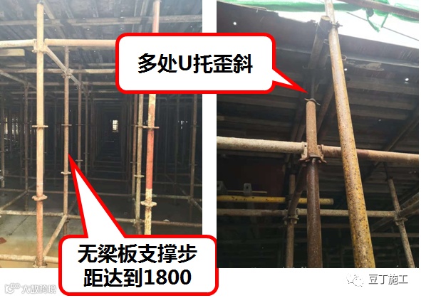 板底模架搭设不规范,架体缺失水平杆,步距过大,U托自由端长度超标、U托歪斜。