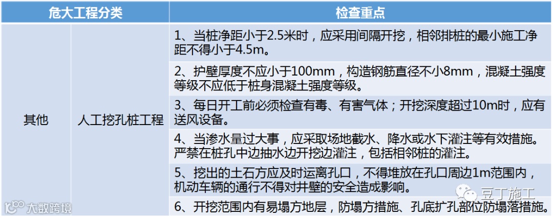 5.检查要求:人工挖孔桩工程主要材料进场质量检查、抽检,过程中对照专项施工方案有关检查内容等。