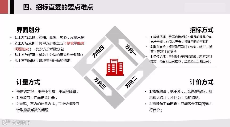 4.招标直委要点难点:招标方式,计价方式,计量方式,界面划分进行重点介绍;