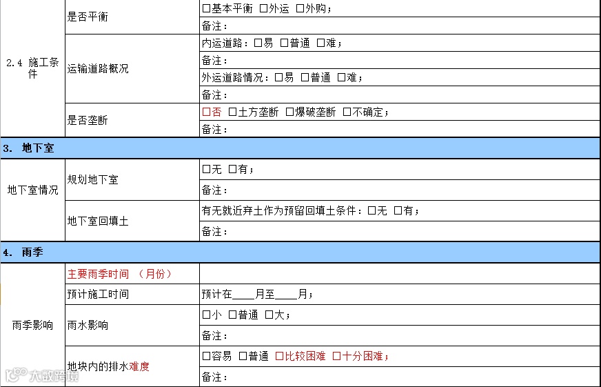 投资拓展小组人员只需要根据踏勘清单一一完成相关要素的调研,避免人为经验,缺漏相关调研因素,某标杆企业的“土方踏勘清单样表”如下: