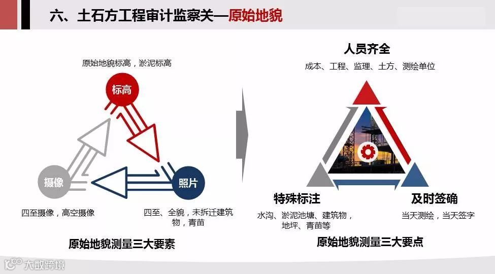 6.土石方监察审计关:测绘方式,原始地貌,开挖方案,阐述了三个方面的注意事项