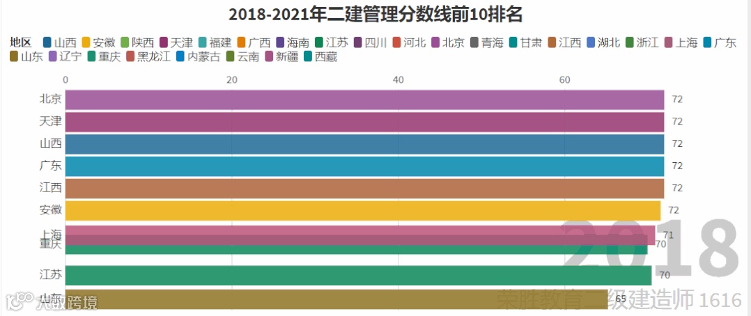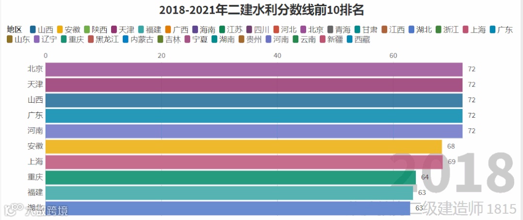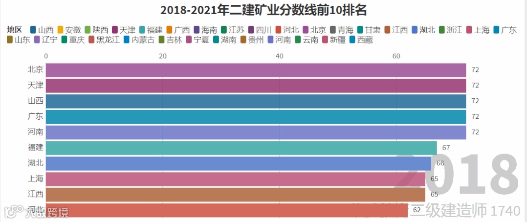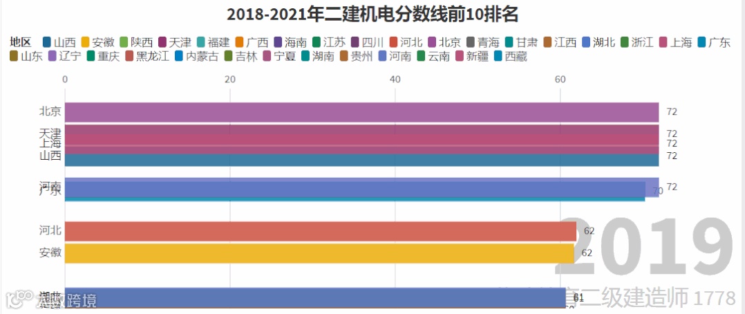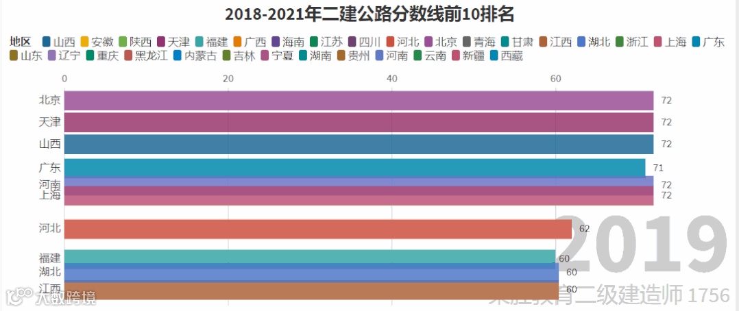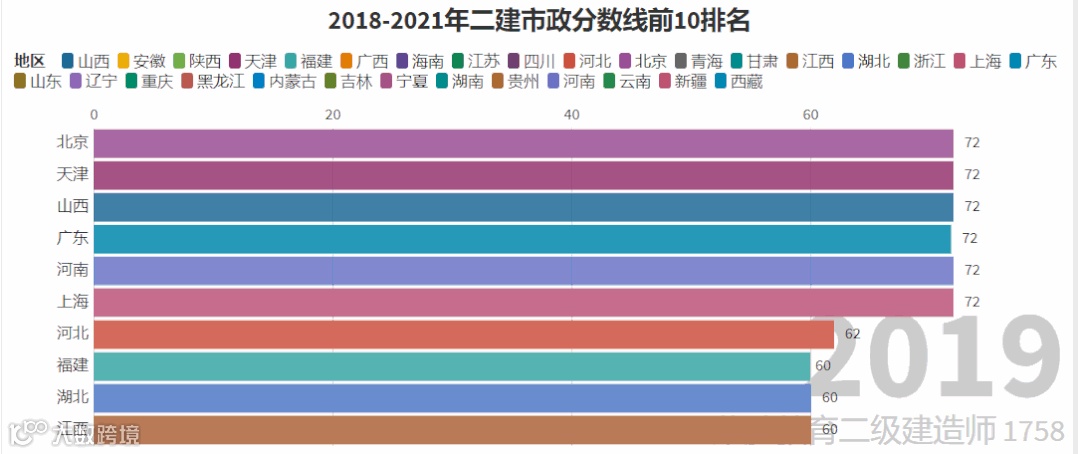 我们以近4年的及格线线标准作为参考,制作了二建各专业排名前10位的省份变化图,它的变化趋势很大程度上反映着各地区二建考试的通过难度。