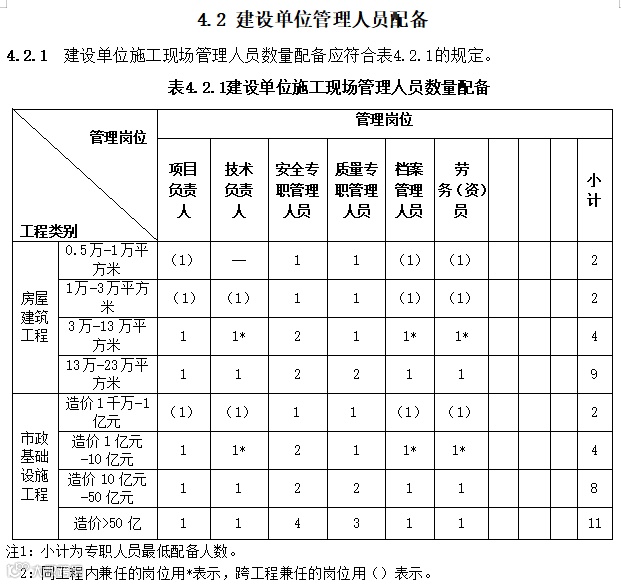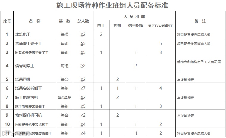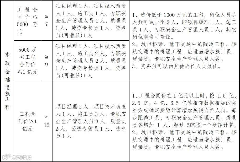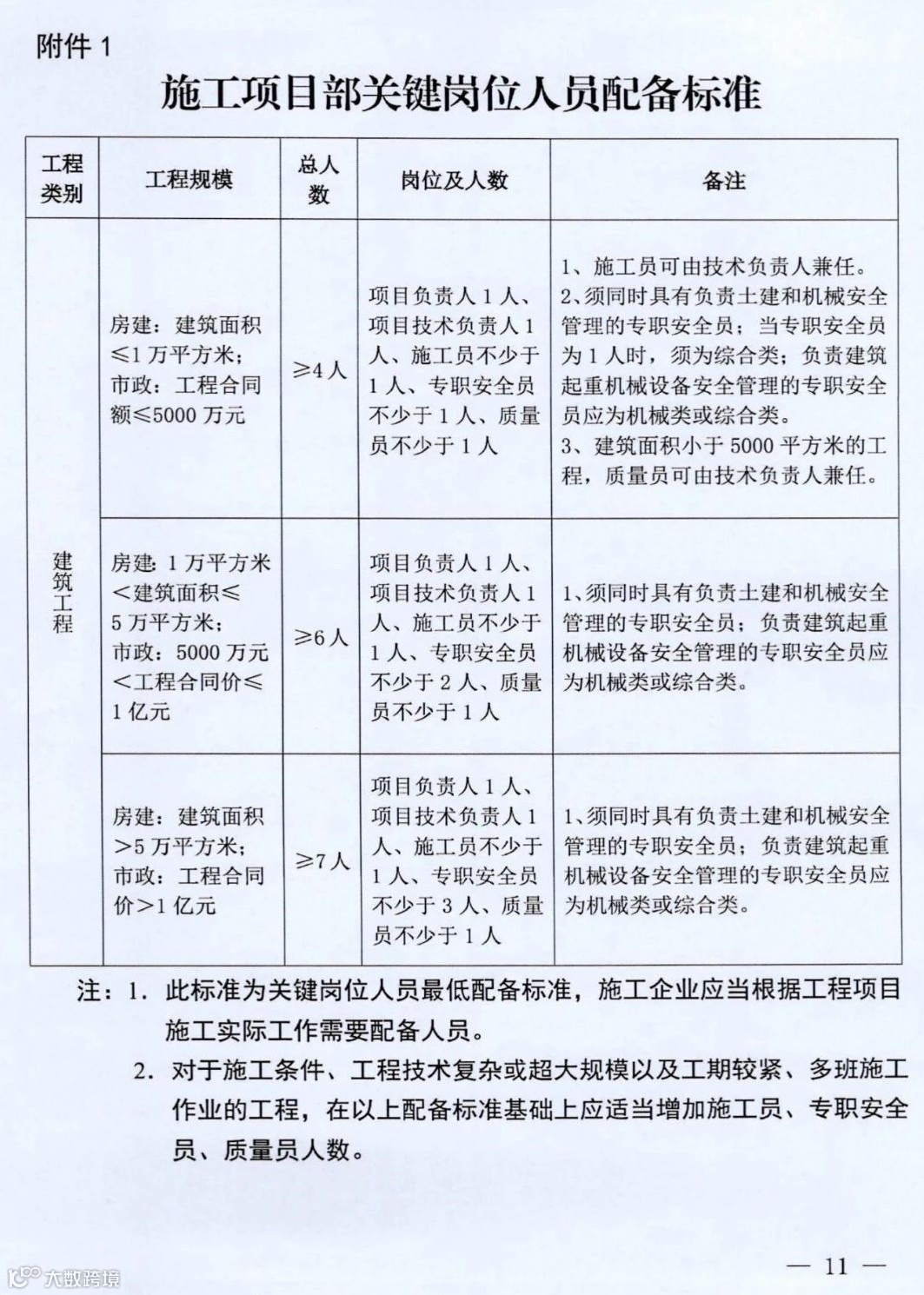 (1)此标准为关键岗位人员最低配备标准,施工企业应当根据工程项目施工实际工作需要配备人员。