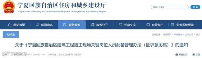 1月6日,宁夏住建厅发布关于《宁夏回族自治区建筑工程施工现场关键岗位人员配备管理办法(征求意见稿)》的通知。