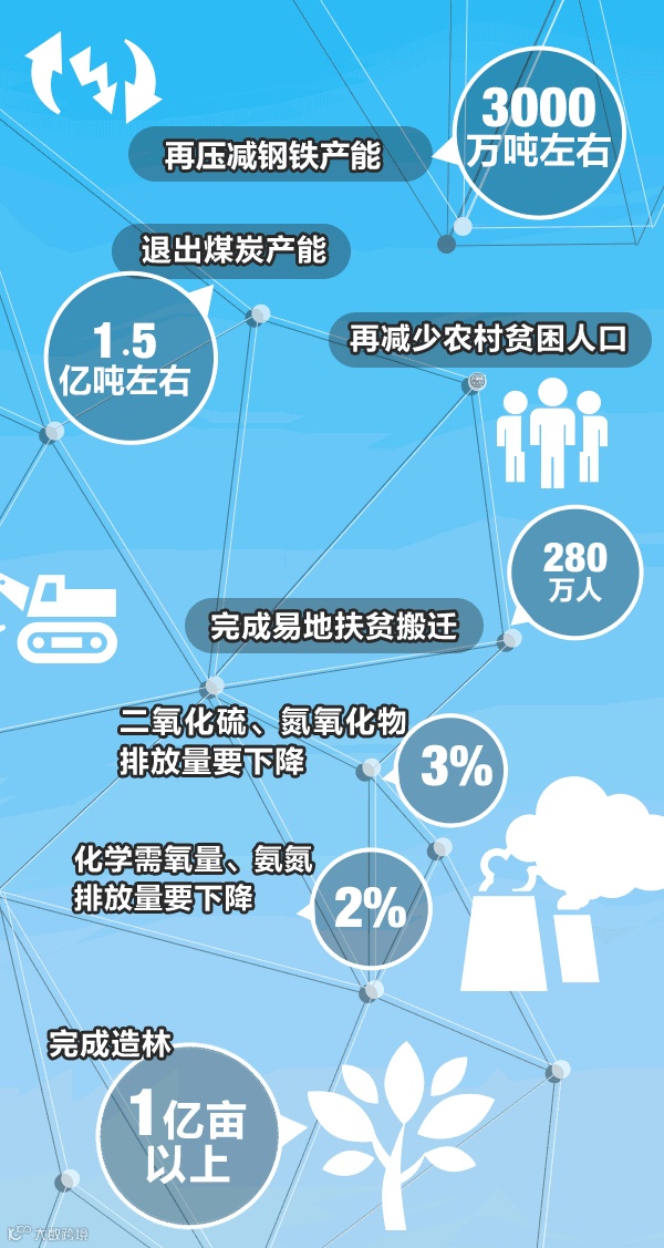 去产能:再压减钢铁产能3000万吨左右,退出煤炭产能1.5亿吨左右。