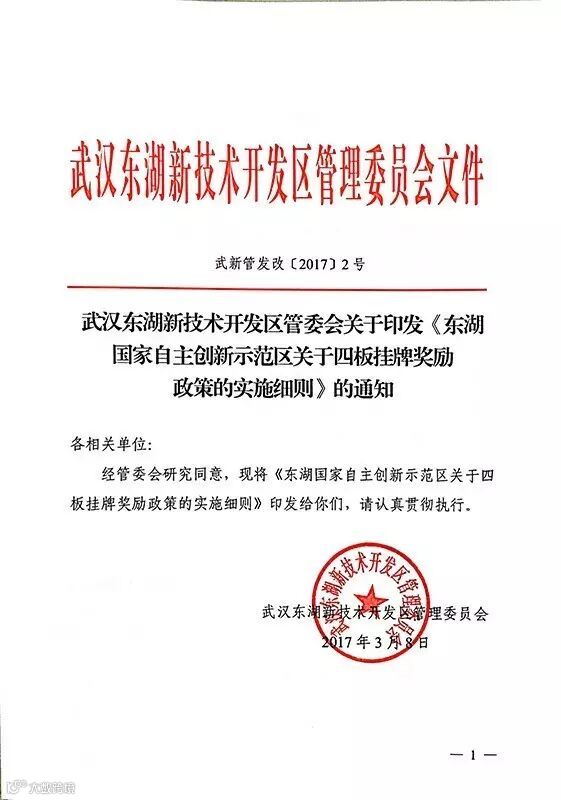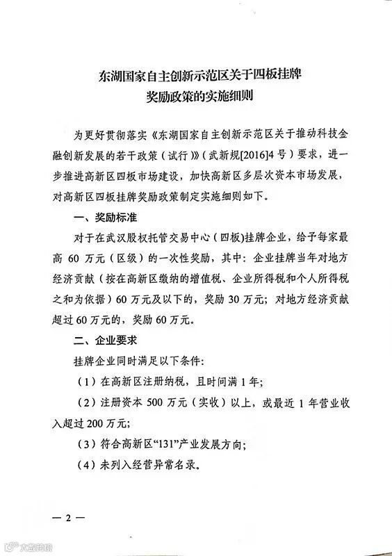 导读:各相关单位: 经管委会研究同意,现将《东湖国家自主创新示范区关于四板挂牌奖励政策的实施细则》印发给你们,请