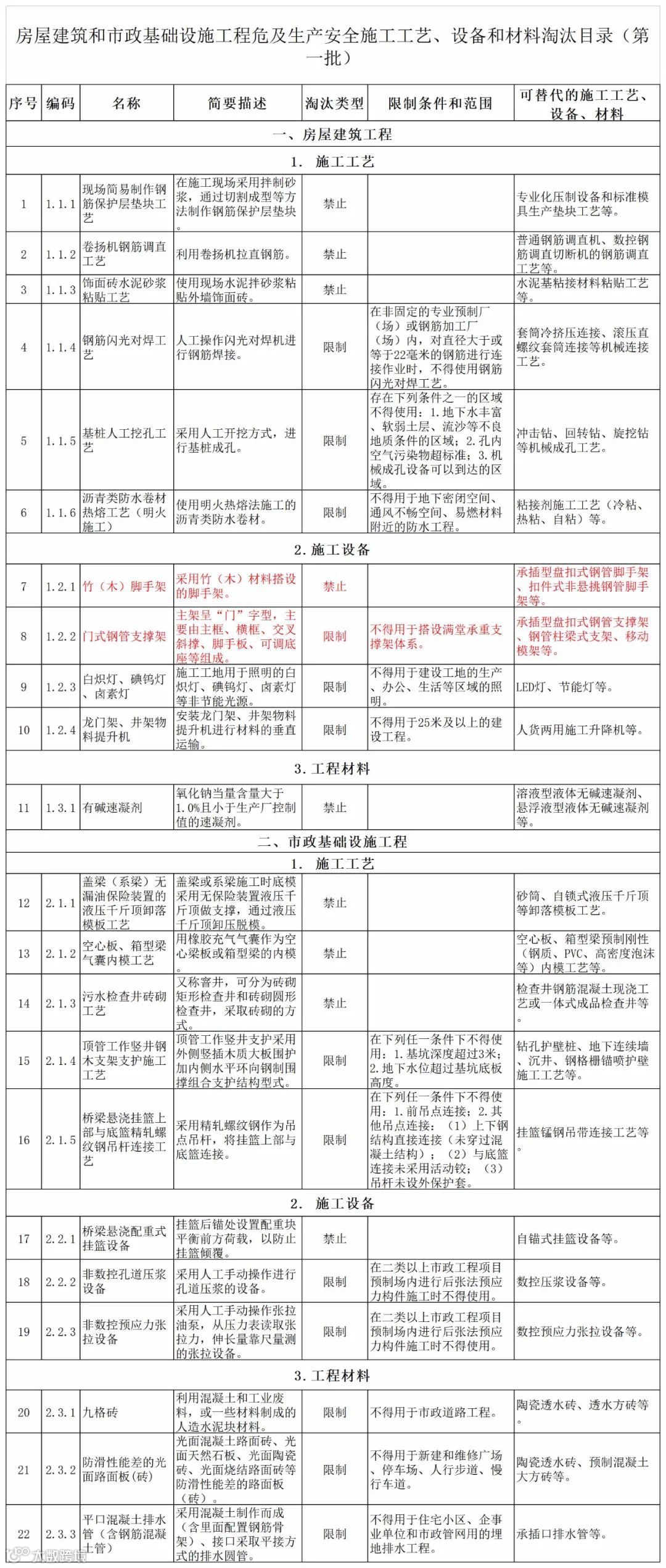 2021年12月30日,住房和城乡建设部正式发布《房屋建筑和市政基础设施工程危及生产安全施工工艺、设备和材料淘汰目录(第一批)》的公告。