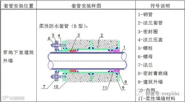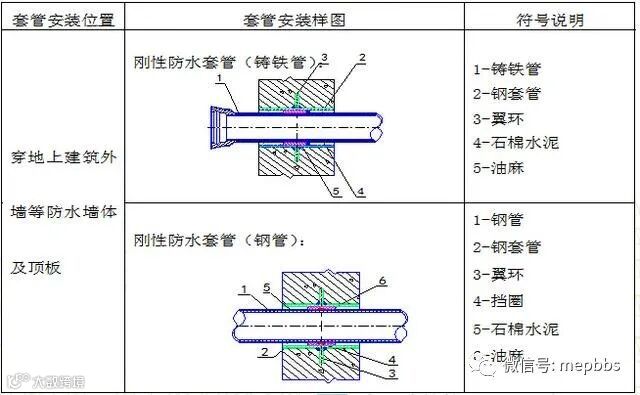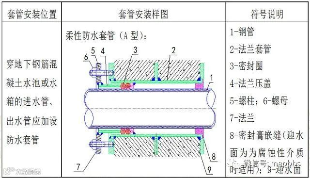 4、地下室外墙有严格防水要求的必须采用柔性防水套管,出屋面、地下室顶板和露台管道必须设刚性防水套管。