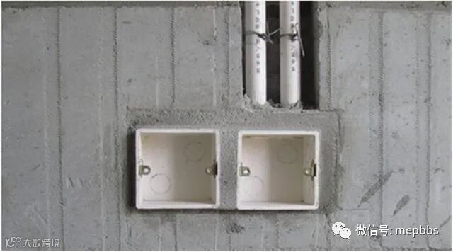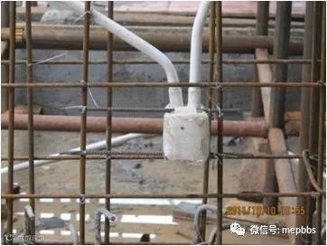 现浇混凝土墙柱上的电盒预埋施工时要控制好标高及与墙面的距离。在埋设时为了防止位置偏移,在预埋管和线盒用4根附加钢筋箍起来,再与主筋绑扎牢固。限位筋紧贴线盒,与主筋用粗铁丝绑扎,不允许点焊主筋。