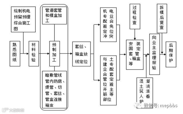 2、施工人员须配合土建按施工图和深化设计图进行管路、铁构件及设备基础、孔洞的预留预埋。在结构施工时,预留预埋要紧跟结构进度,具备条件时及时穿插施工,并做好隐预检报验工作,严禁错留、漏留。