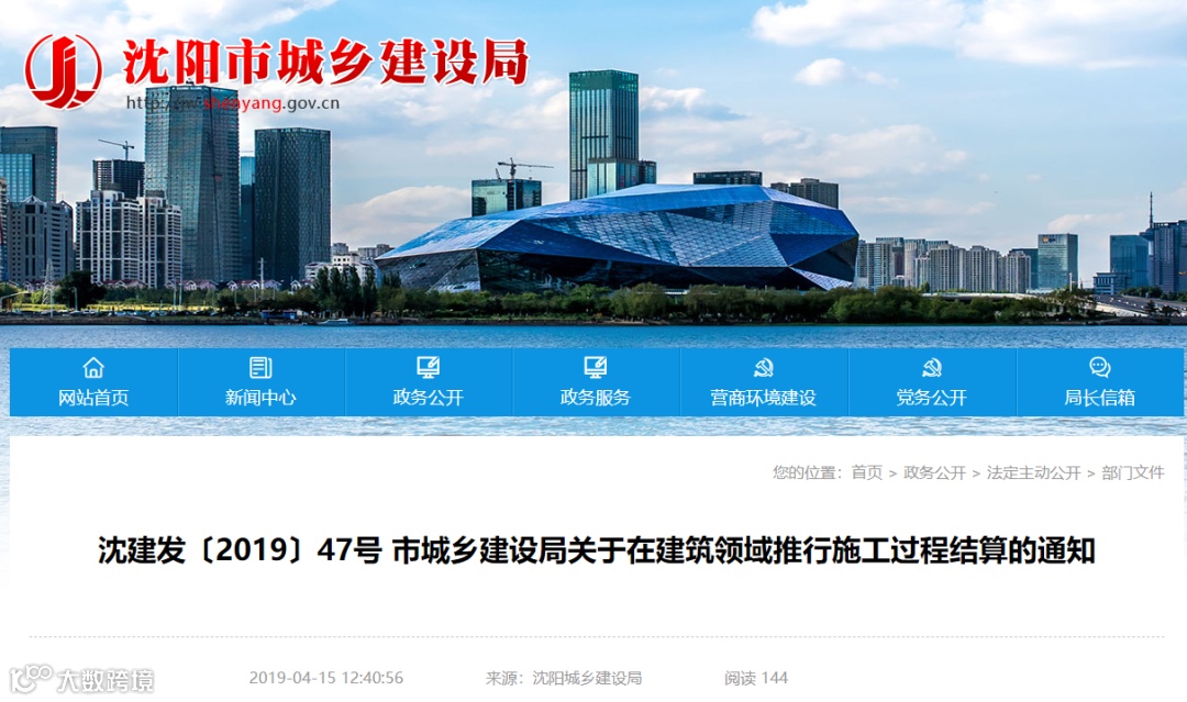 2019年4月,沈阳市城乡建设局发布关于在建筑领域推行施工过程结算的通知,自2019年1月1日起执行。