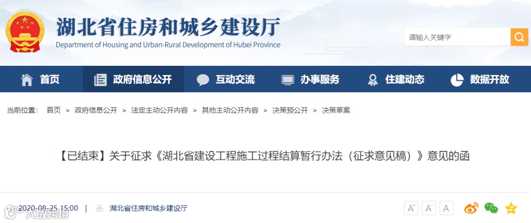 2020年8月25日,湖北省住建厅发布《湖北省建设工程施工过程结算暂行办法(征求意见稿)》。